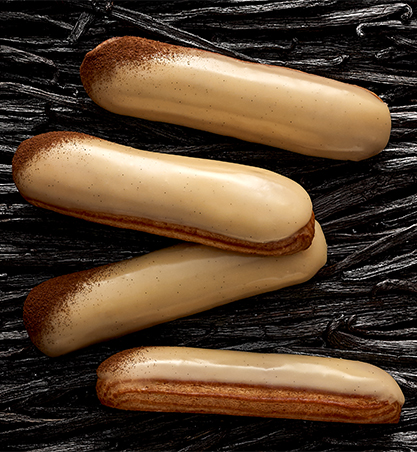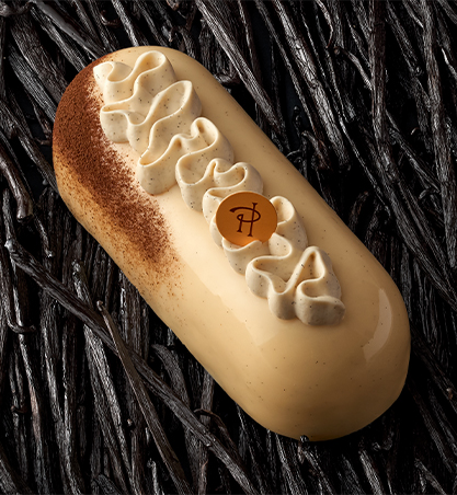 Pâte à choux aux éclats d'amandes grillées, crème mousseline aux vanilles de Tahiti, Mexique et Madagascar, éclats d'amandes caramélisées