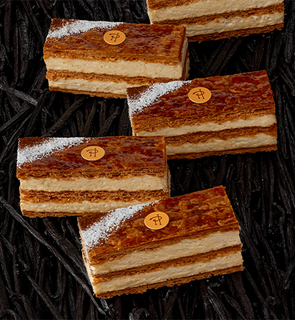 Shortbread pastry, cake imbibed with vanilla, vanilla ganache and mascarpone cream with vanillas from Tahiti, Mexico and Madagascar