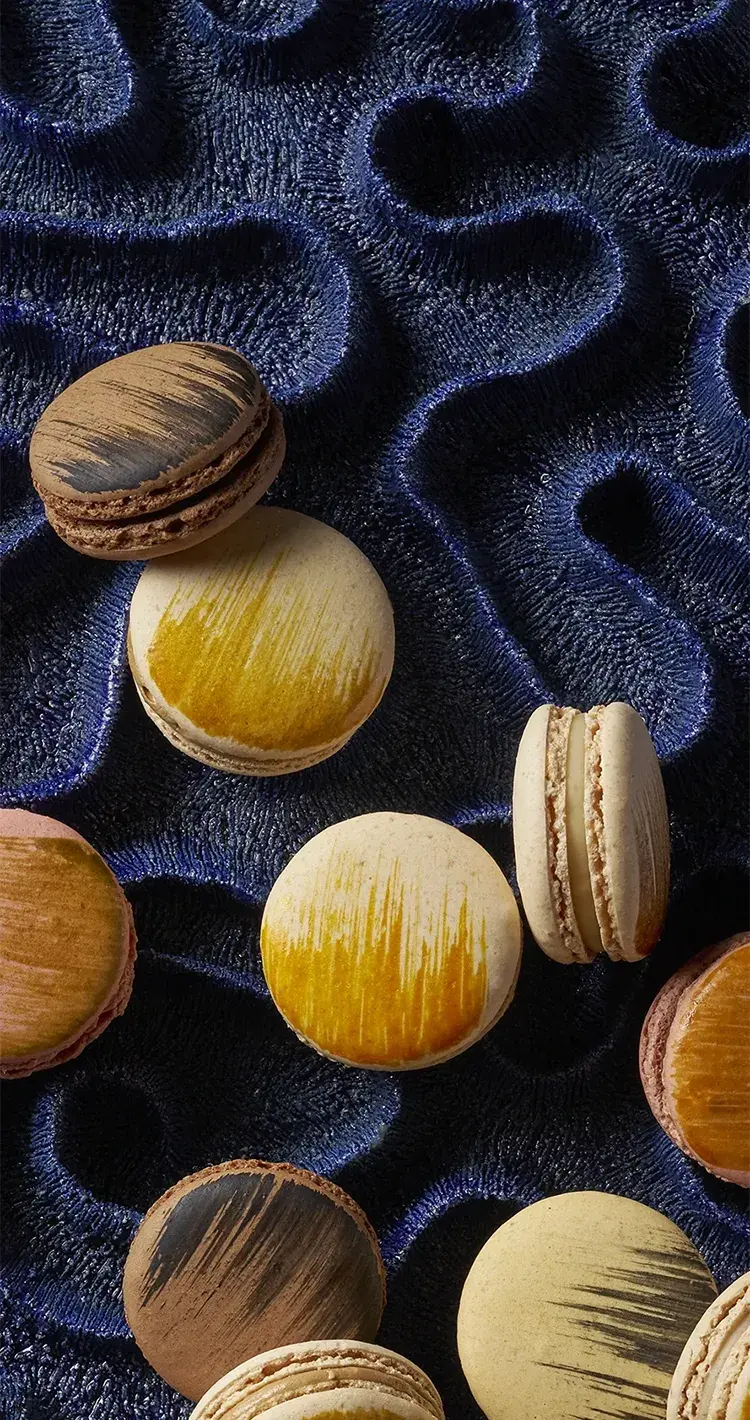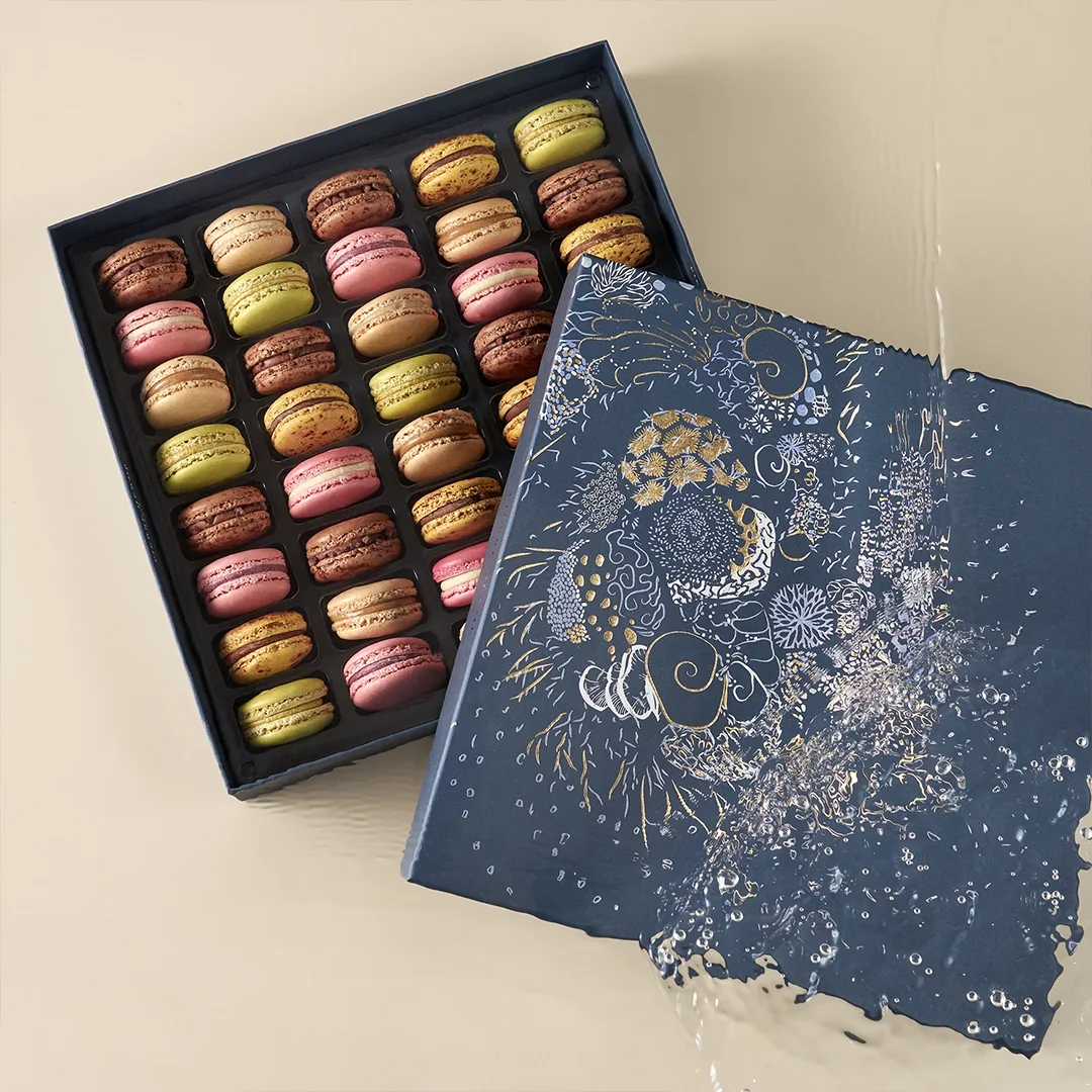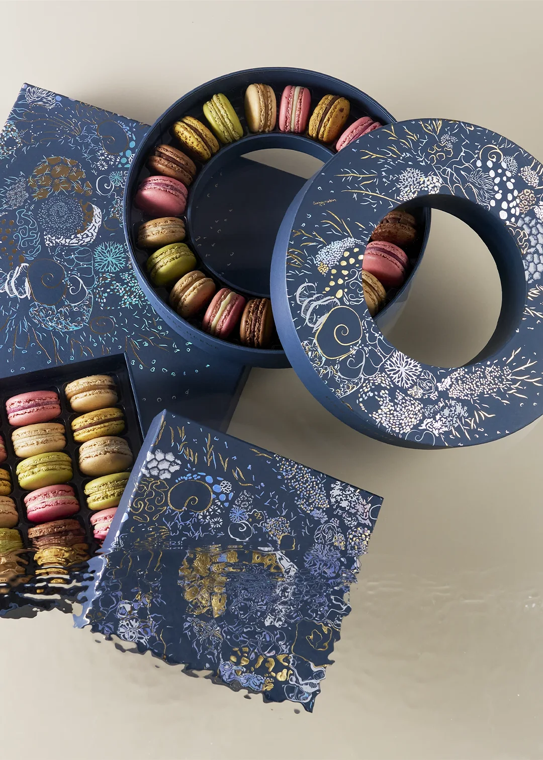 Les coffrets de macarons de Noël associent saveurs Signature et créations exclusives imaginées pour les fêtes. Chaque écrin aux nuances de bleus, touches d’or et élégants reliefs célèbre le monde marin imaginé par Courtney Mattison.