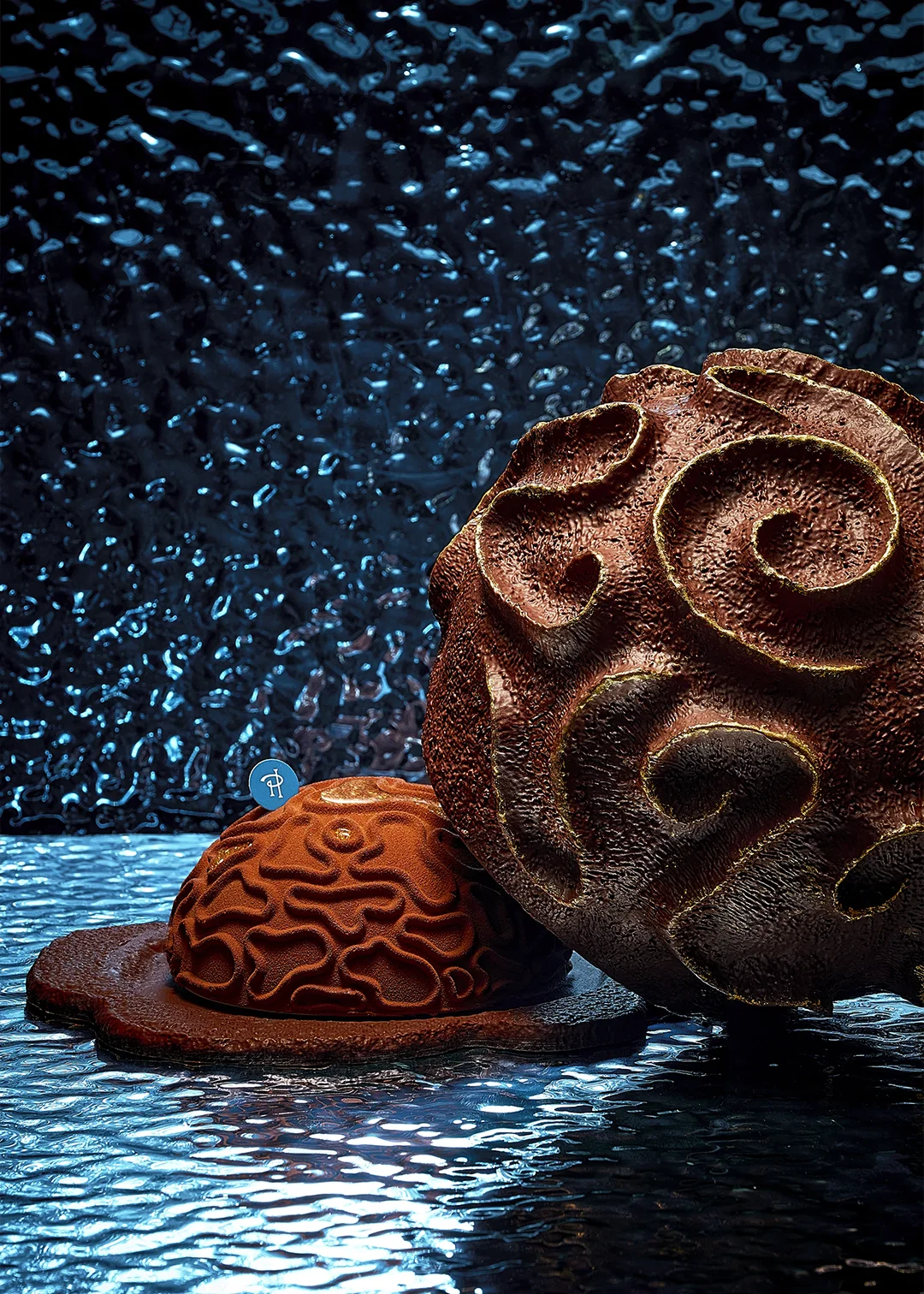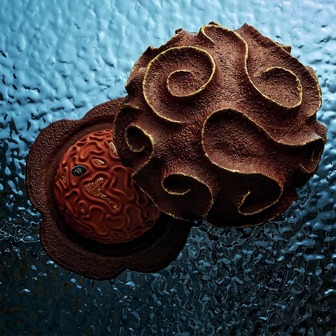 Cette pièce inédite est un fantasme, une sculpture extraite de l’oeuvre de Courtney Mattison. On y découvre le dôme de la bûche d’exception dans une sculpture en chocolat imposante. Les sculptures en chocolat qui l’entourent sont garnies tantôt de bonbons de chocolat, tantôt de noisettes caramélisées, de mendiants ou de praliné Infiniment Noisette puis assemblées et peintes à la main prenant la forme d’un récif extraordinaire pesant près de 12kg ! Une oeuvre artistique nécessitant un grand nombre d’heures de travail de la part de nos artisans chocolatiers.