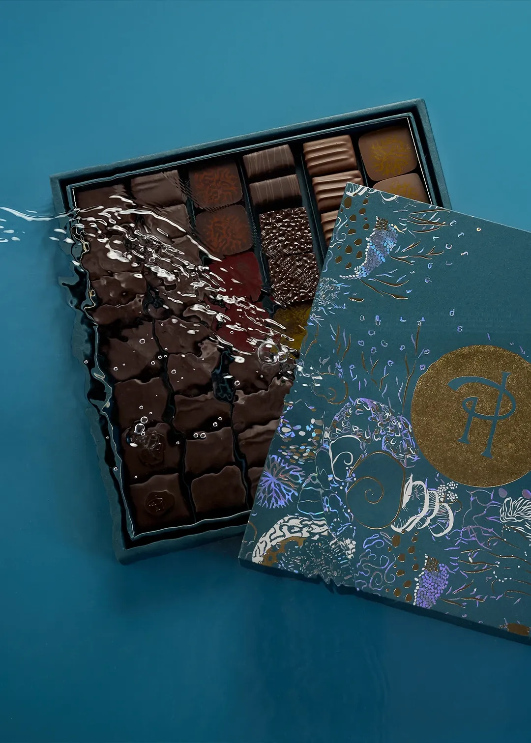 Nuances de bleus, touches d’or et élégants reliefs aux couleurs d’écume, chaque écrin célèbre le chocolat et le monde marin imaginé par Courtney Mattison. Œuvres à part entière, on y découvre des secrets infiniments gourmands - bonbons chocolat, truffes et marrons glacés. Une collection de coffrets aux tonalités marines et changeantes pour conserver le souvenir d’une mosaïque aux reflets bleutés doux et apaisants.